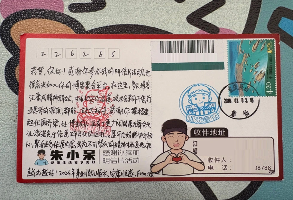 明信片收到啦,非常喜欢!谢谢你的祝福和这份特别的纪念,让我在这个快节奏的时代感受到了手写的诚意,还让我们看到了这么多博友的精彩分享。你的祝福我收下了,也祝你 2026 年事业顺利,平安顺遂,期待你的博客未来有更多的精彩内容!